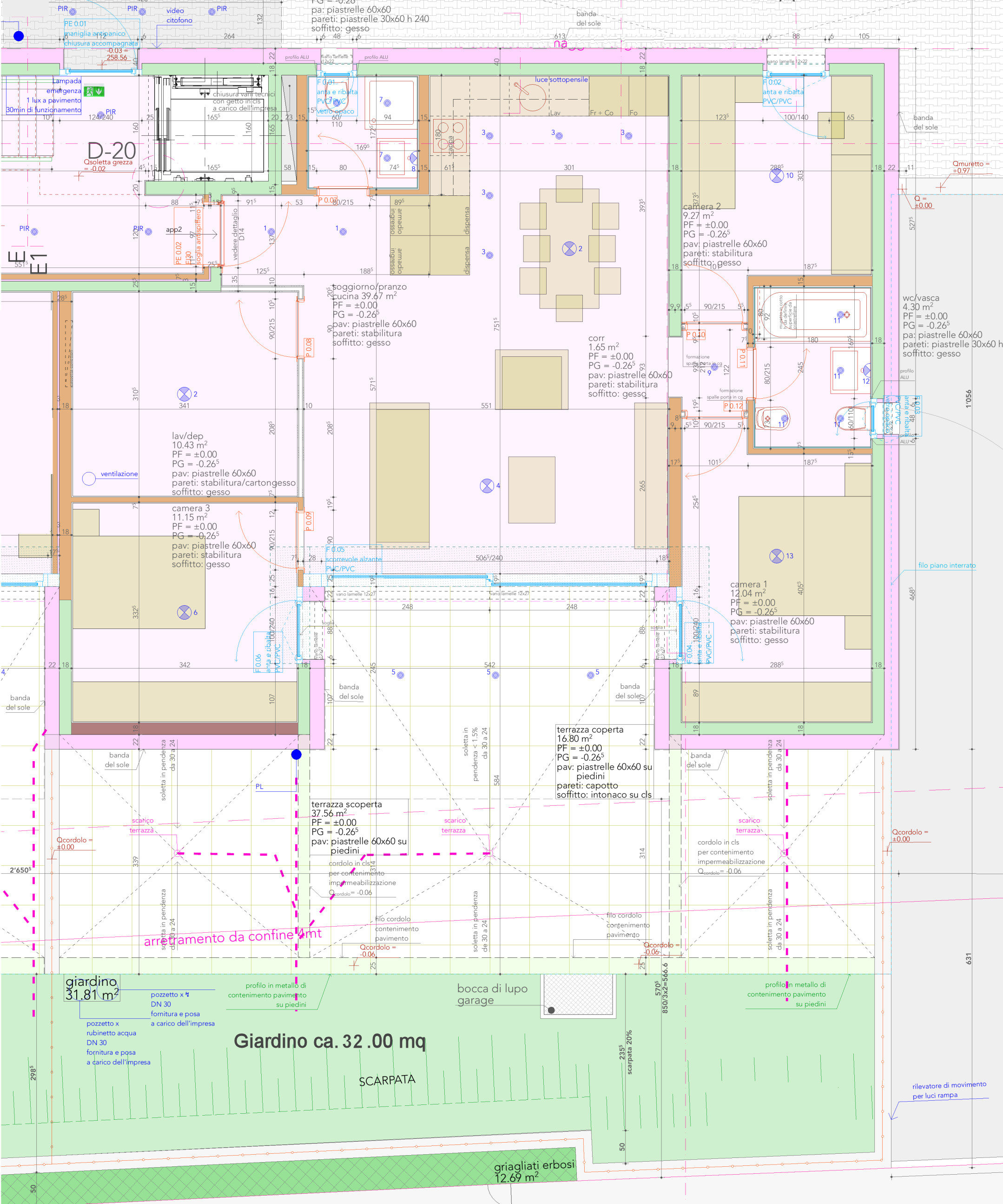 Divisori interni in mattoni di cotto e/o cartongesso. Particolare attenzione è stata data agli aspetti energetici: Impianto a regolazione individuale per ogni locale, termopompa e distribuzione calore con serpentine a bassa temperatura posate a pavimento e pannelli solari posati sul tetto.