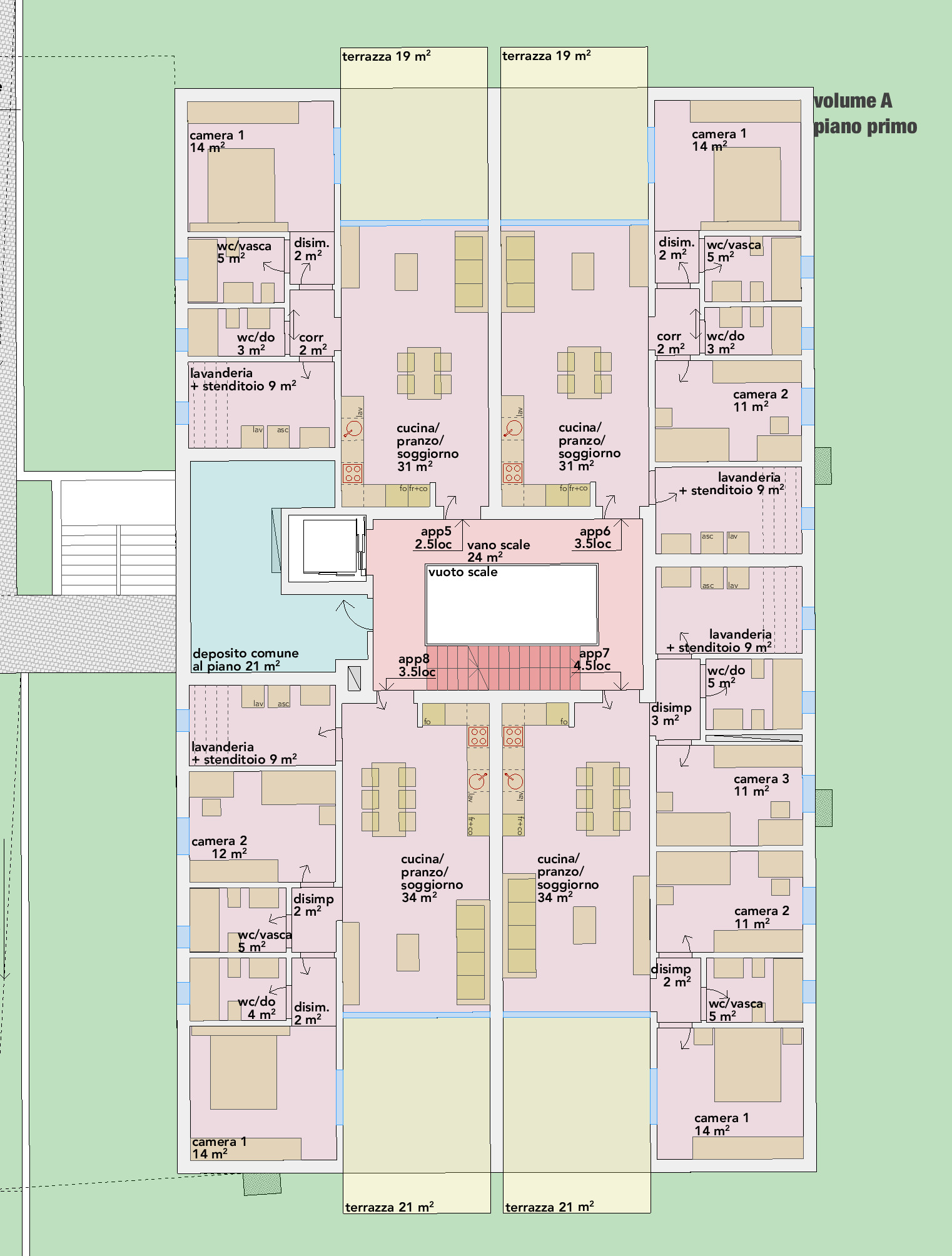 L’edificazione prevede la realizzazione di due stabili indipendenti di 3 piani su due livelli differenti che distribuiscono le abitazioni tra il piano terreno ed il secondo piano.