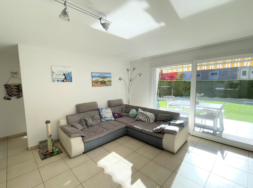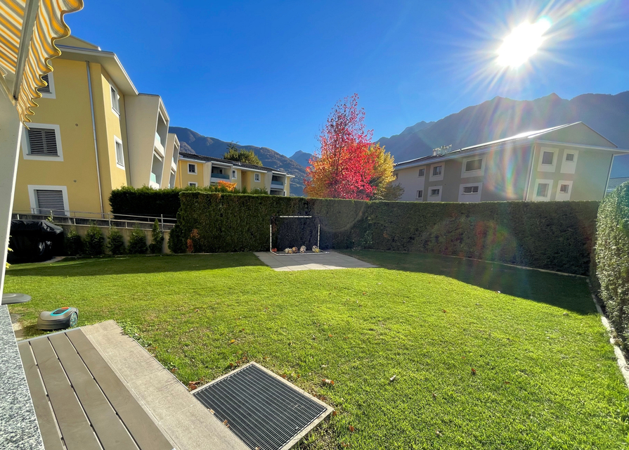 La rasatura dell’erba avviene tramite il comodo robottino già installato e l’irrigazione è automatica.