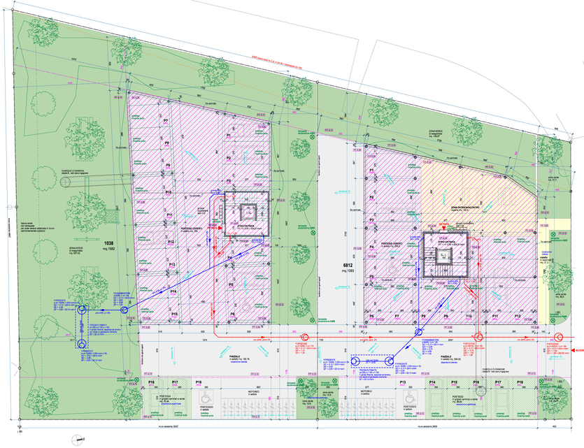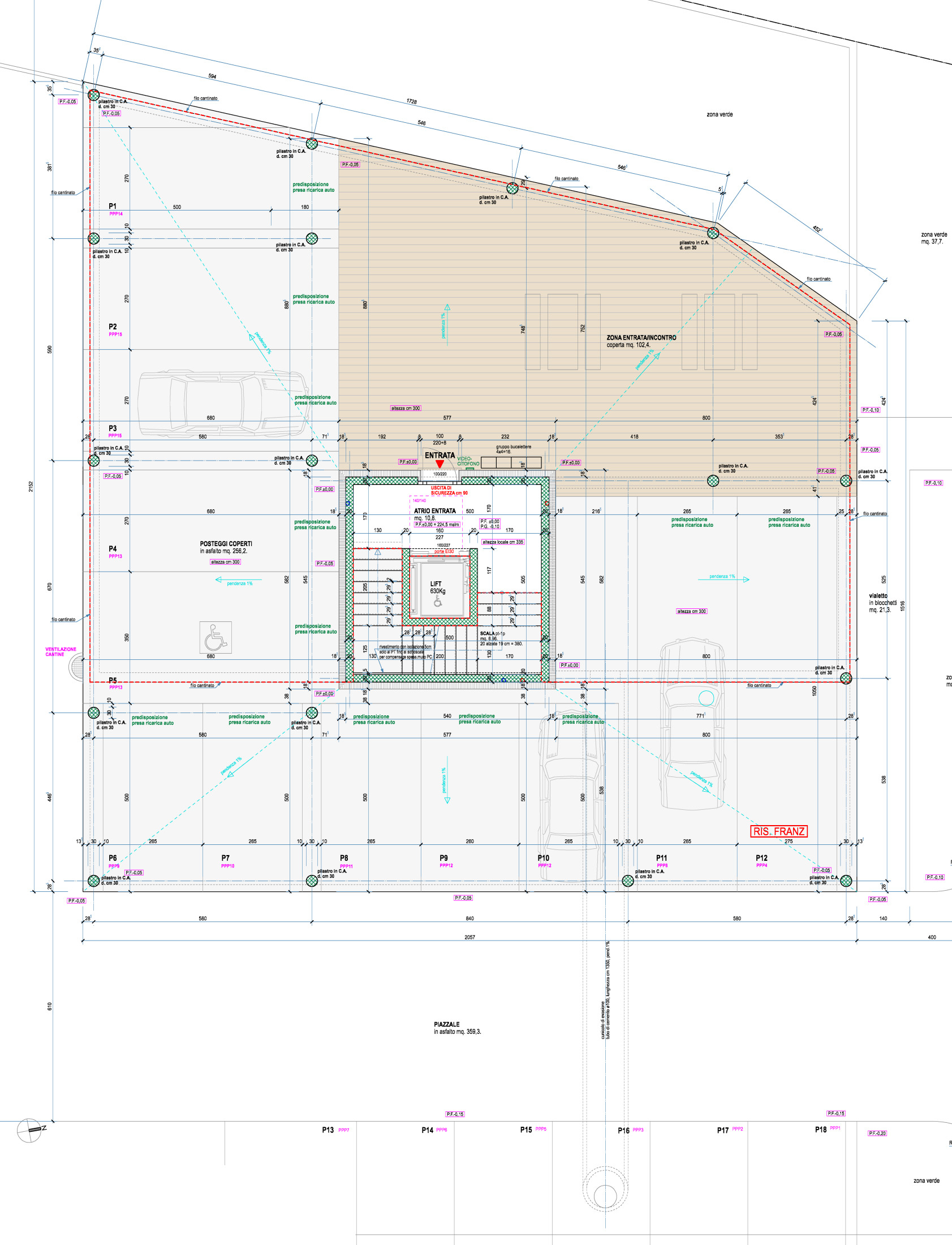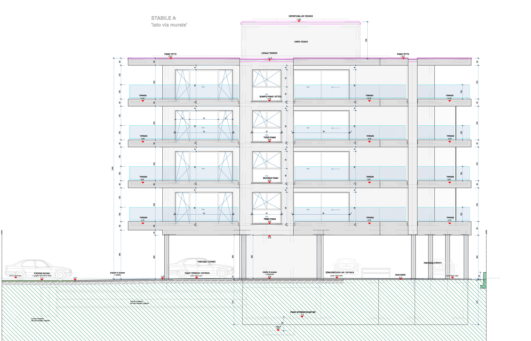 Ogni appartamento dispone di uno o due posteggi al piano entrata, a seconda della dimensione e posizione dell’appartamento.