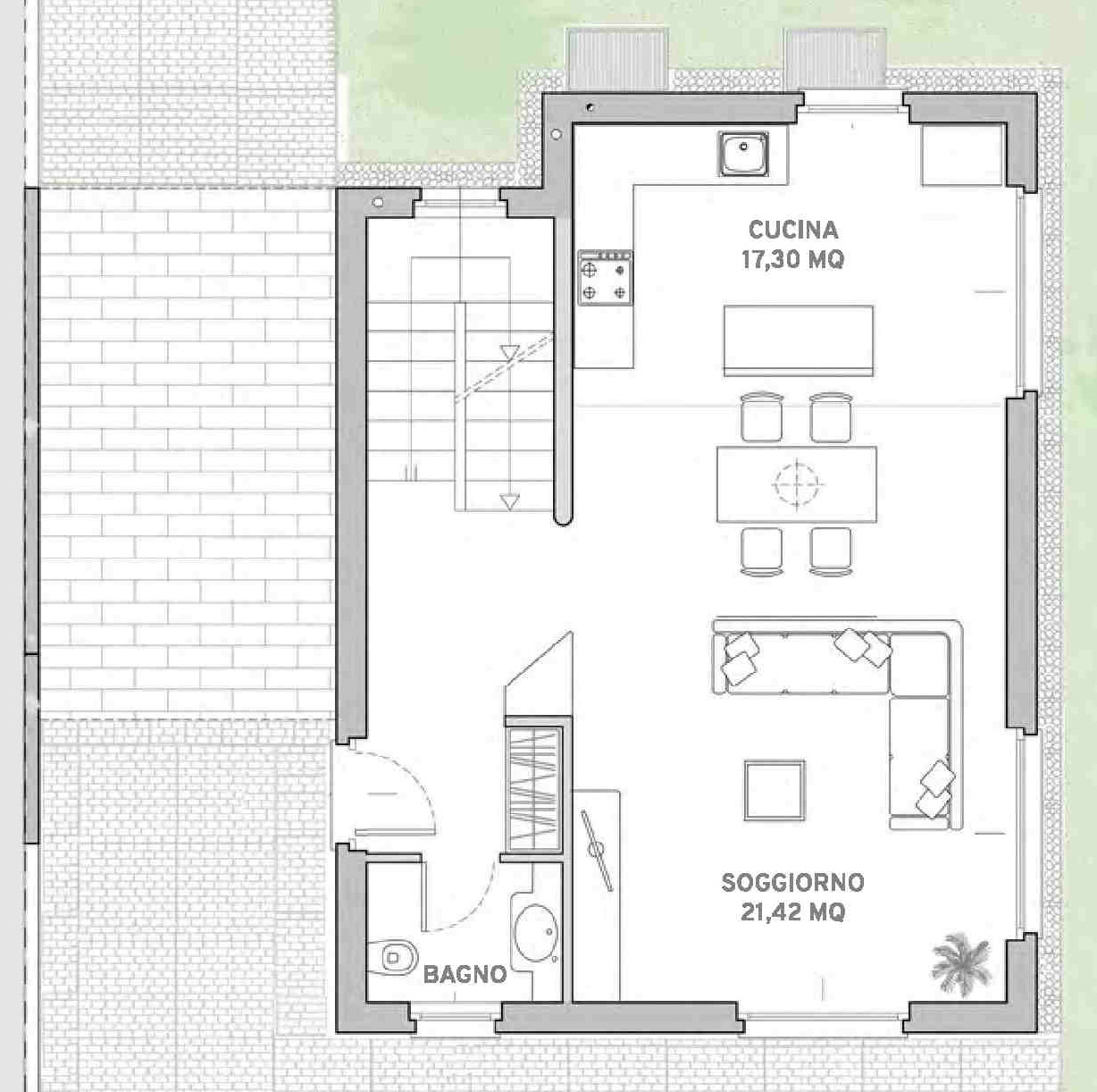 Al piano terreno, adibito a zona giorno, si trovano l’atrio entrata, il soggiorno, la cucina e un servizio ospiti.