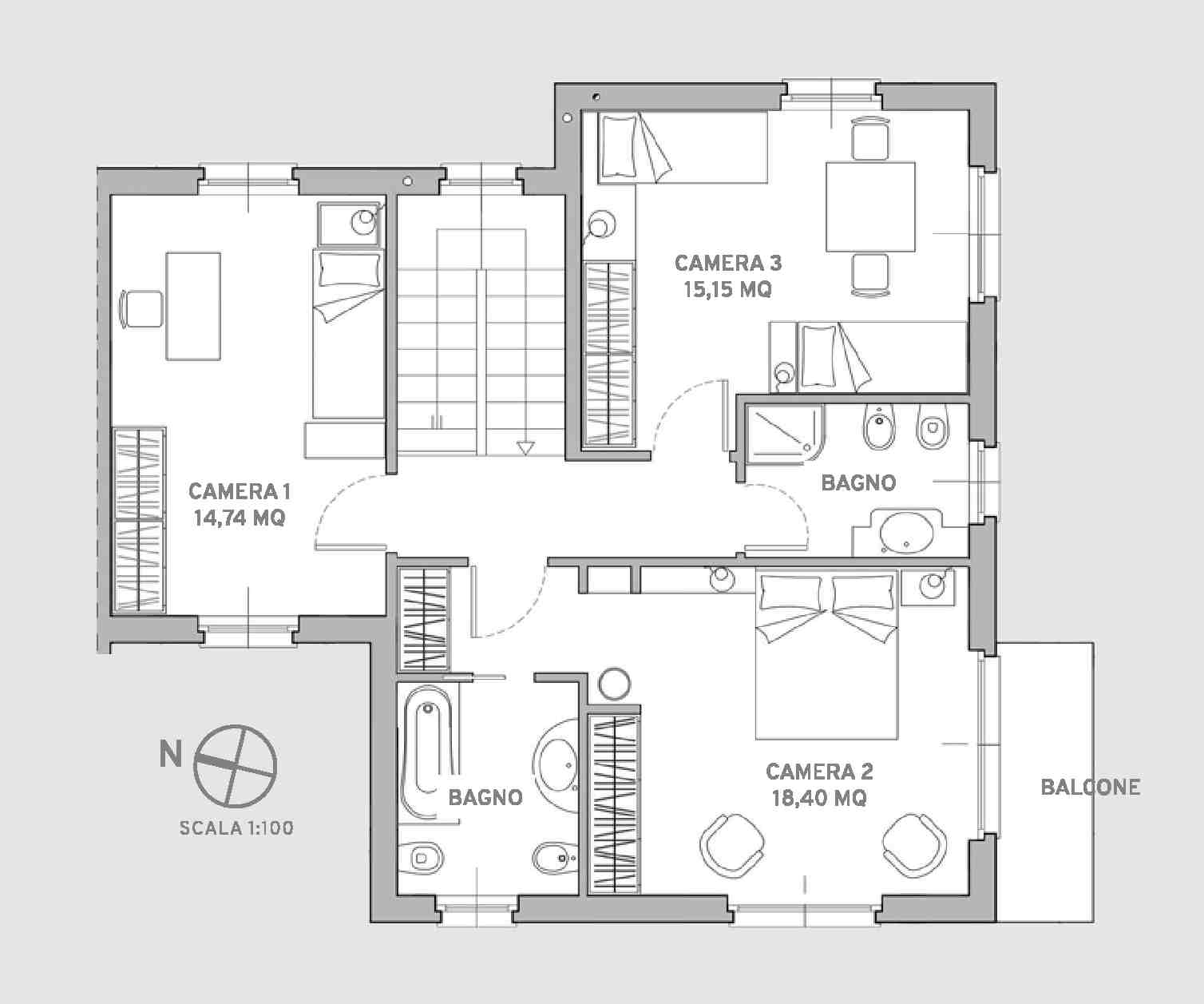 Il primo piano, adibito a zona notte, è composto da tre camere da letto di cui una con bagno padronale, un secondo servizio con doccia ed il balcone.