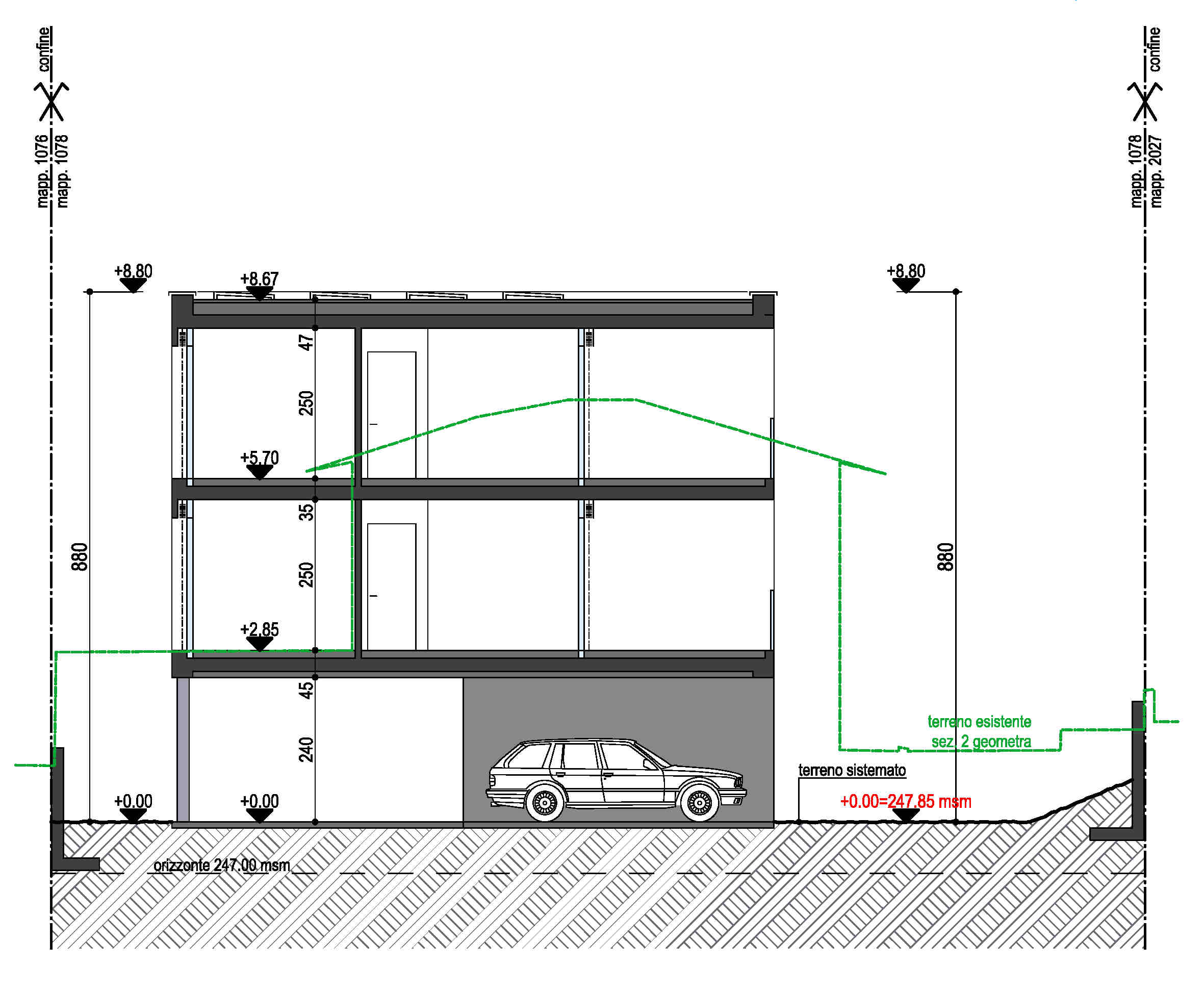 Al livello inferiore, piano terreno, si trovano i posti auto ed i giardini privati.