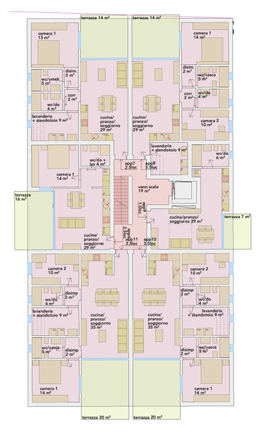 L’edificazione prevede la realizzazione di due stabili indipendenti di 3 piani su due livelli differenti che distribuiscono le abitazioni tra il piano terreno ed il secondo piano.